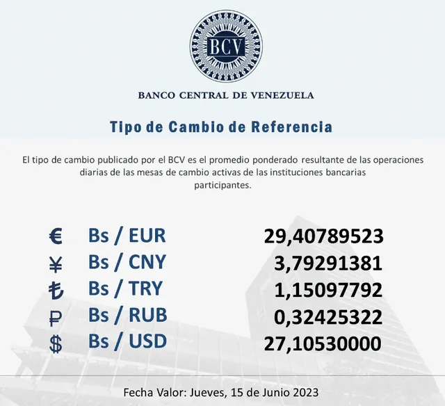 El Banco Central de Venezuela, BCV, informa que el tipo de cambio promedio ponderado resultante de las operaciones diarias de las mesas de cambio activas de las instituciones bancarias participantes se ubicó en 27,1053Bs/USD, presentando un incremento de 0,08 bolívares (+0,32%).