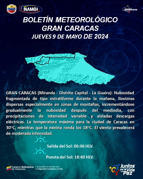 Por su parte, la temperatura máxima para la ciudad de Caracas es de 30 grados centígrados, mientras que la mínima ronda 18 grados centígrados, el viento prevalecerá de moderada intensidad.