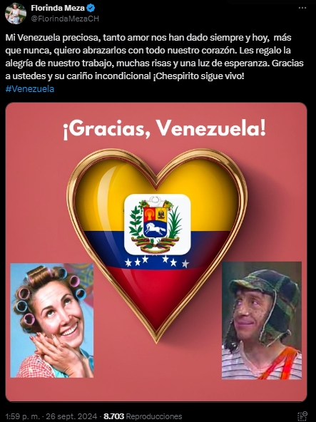 La actriz mexicana Florinda Meza, icónica por su papel de Doña Florinda en el recordado programa “El Chavo del 8”, expresó su cariño y apoyo a los venezolanos a través de su cuenta en X este jueves 26 de septiembre.