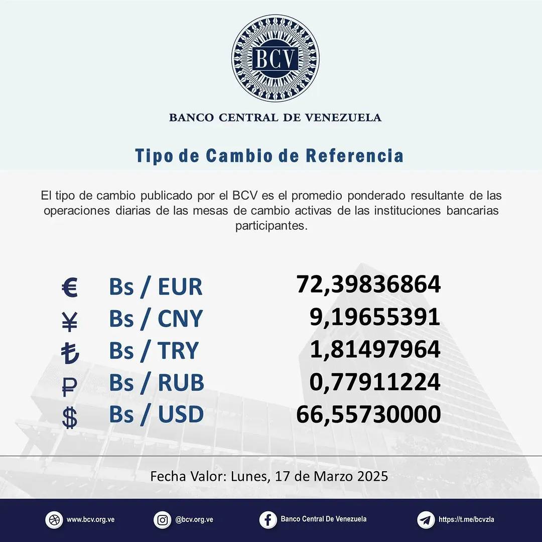 | 14/03/2025 | Banco Venezolano de Crédito | 66,4294 | 66,6604 |