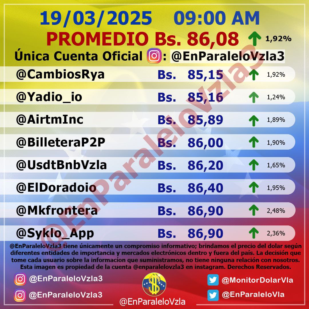 Mientras, el precio del dólar hoy en Venezuela refleja que el cambio en Cúcuta, Colombia, en la frontera con Venezuela, fue de 73,54 bolívares. De igual modo, el dólar Bitcoin está en Bs. 86,48.