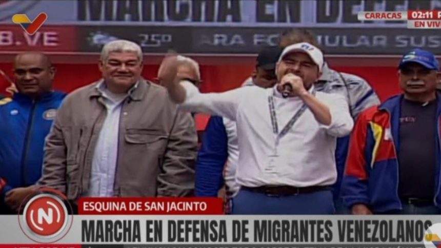 En un evento realizado en una plataforma en la intersección de San Jacinto, el Ministro de Educación Universitaria de Venezuela, Ricardo Sánchez, se reunió con las familias de venezolanos detenidos de manera ilegal en El Salvador.
