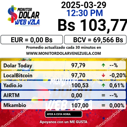 Mientras, el precio del dólar hoy en Venezuela refleja que el cambio en Cúcuta, Colombia, en la frontera con Venezuela, fue de 86,04 bolívares. De igual modo, el dólar Bitcoin está en Bs. 97,70.