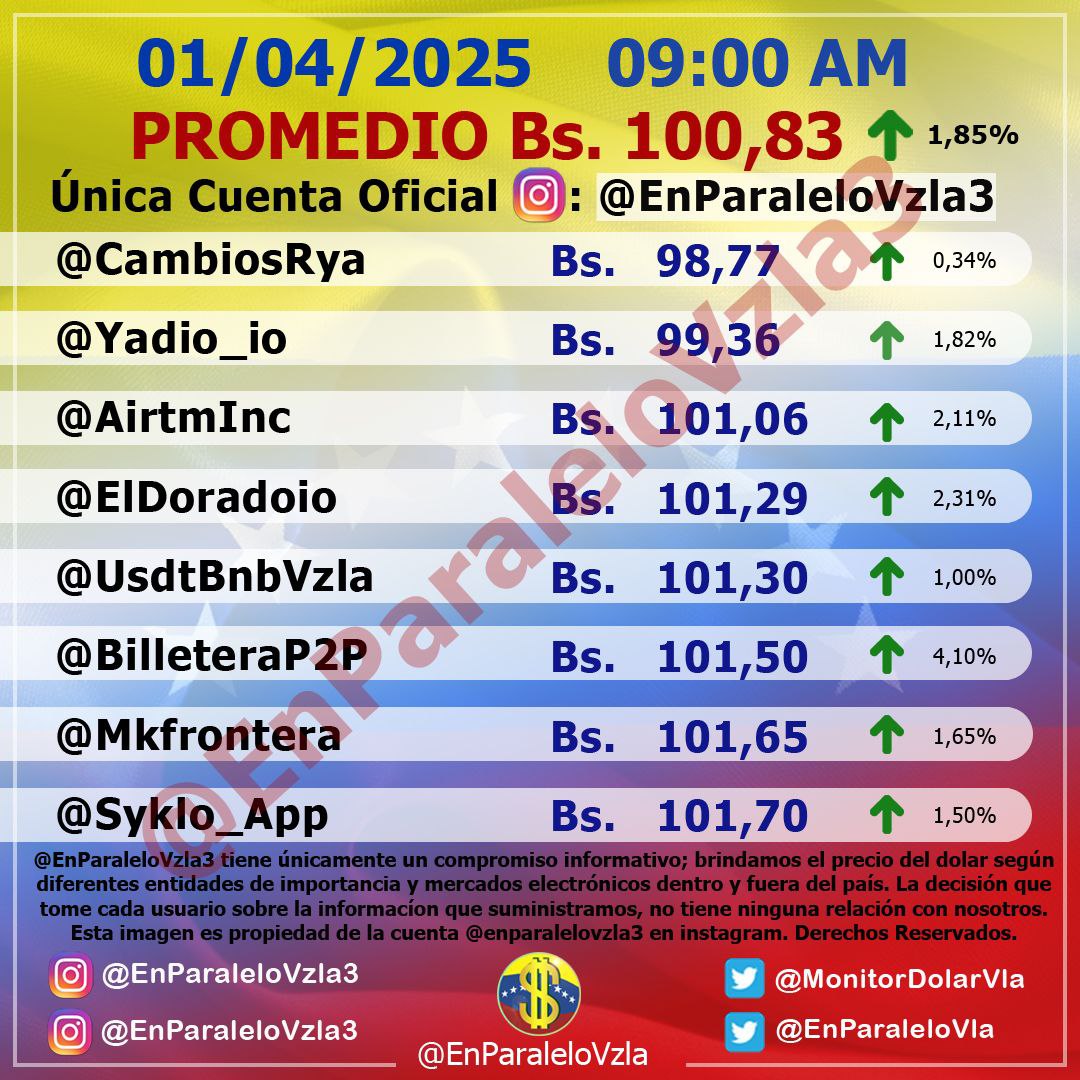 Mientras, el precio del dólar hoy en Venezuela refleja que el cambio en Cúcuta, Colombia, en la frontera con Venezuela, fue de 85,90 bolívares. De igual modo, el dólar Bitcoin está en Bs. 100,40.