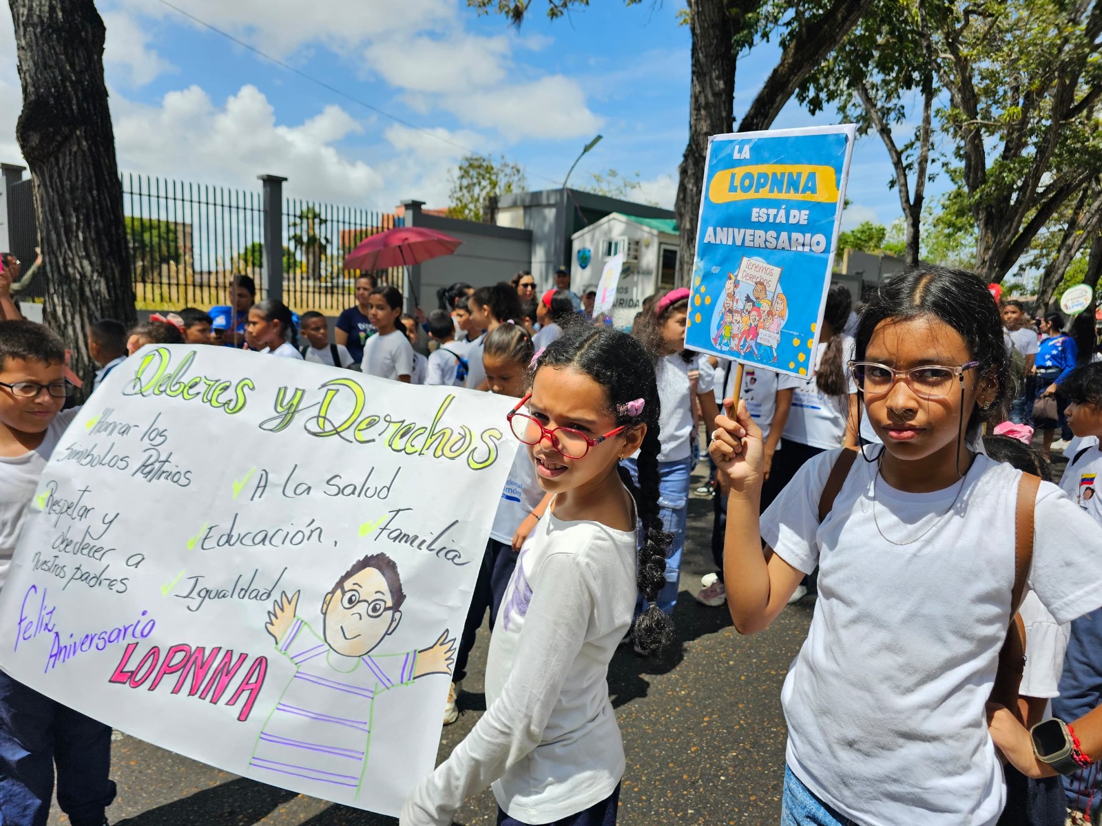 Alumnos de diversas instituciones educativas celebran el aniversario de la LOPNNA con mensajes y pancartas alusivas.