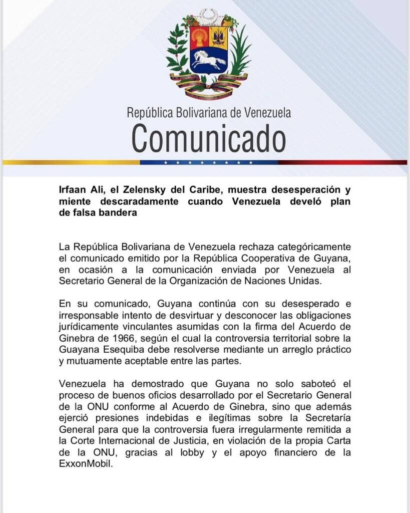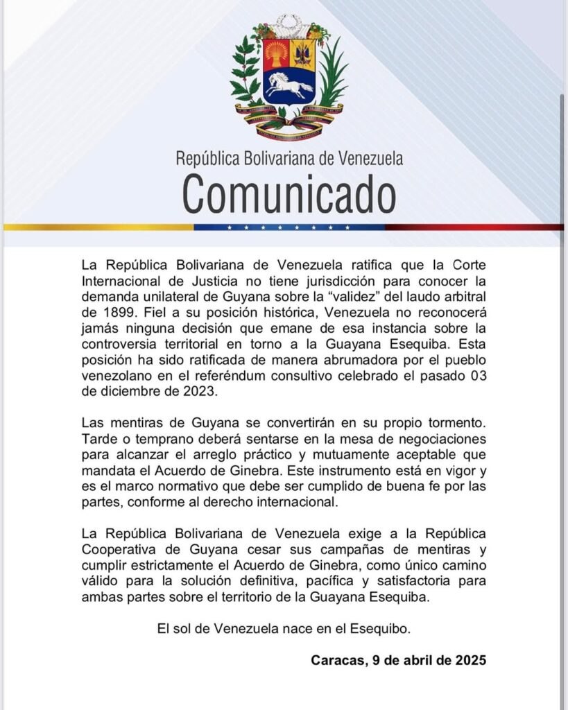 Venezuela instó al gobierno de Guyana a poner fin a sus «campañas de mentiras» y a respetar lo estipulado en el Acuerdo de Ginebra, el cual representa el «único camino legítimo hacia una solución definitiva, pacífica y satisfactoria» de la disputa territorial.