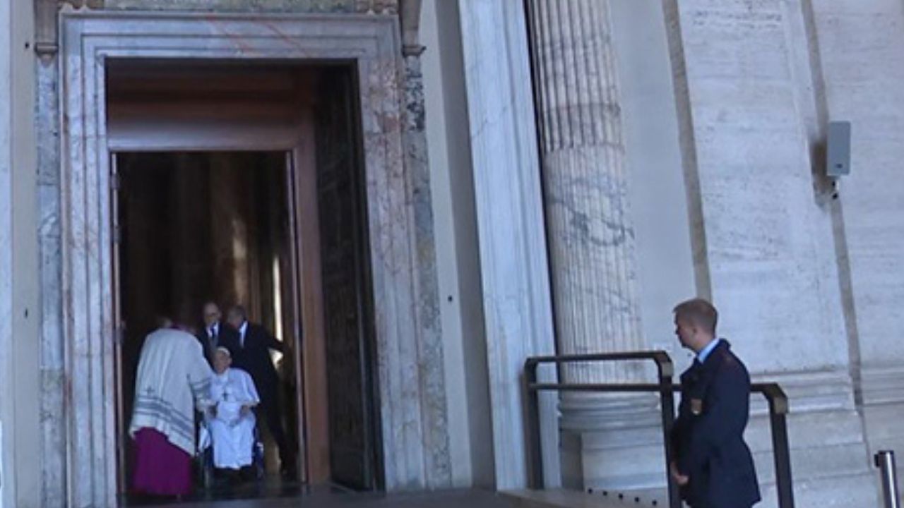 El pontífice en silla de ruedas, entró en la basílica por la Puerta de la Oración, la más cercana a la Casa Santa Marta, donde se encuentra pasando la convalecencia después de haber sido dado de alta tras 38 días ingresado por una grave infección respiratoria.