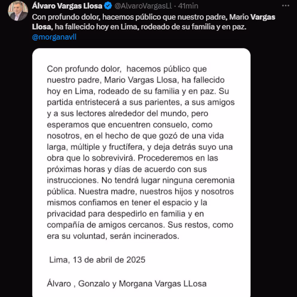 «Con profundo dolor, hacemos público que nuestro padre, Mario Vargas Llosa, ha fallecido hoy en Lima, rodeado de su familia y en paz», escribió su hijo Álvaro Vargas Llosa en su cuenta de la red social X.