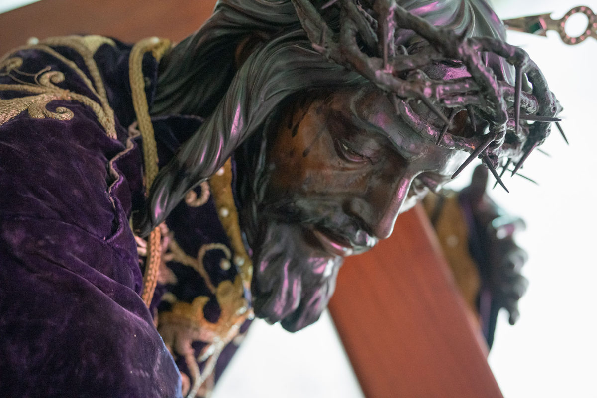 Las orquídeas moradas destacan entre las 1,500 rosas blancas y los numerosos crisantemos que los devotos ofrecieron a la cofradía del Nazareno de San Pablo.