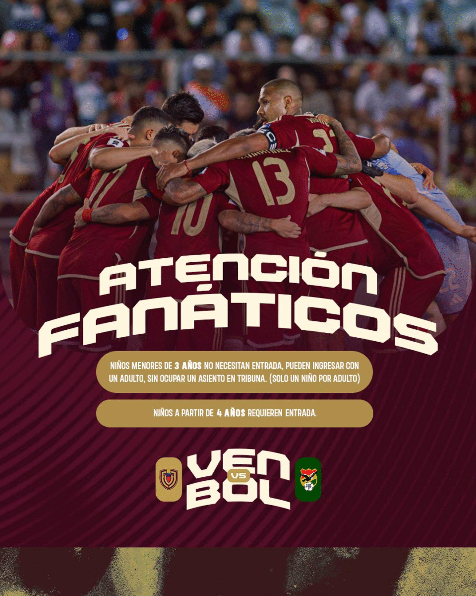 Desde este lunes 28 de abril de 2025, ya estan disponibles las entradas para el partido Venezuela – Bolivia en el estadio Monumental de Maturín, a efectuarse el próximo 4 de junio como parte de la jornada 15 de Eliminatorias Sudamericanas rumbo al mundial de 2026.