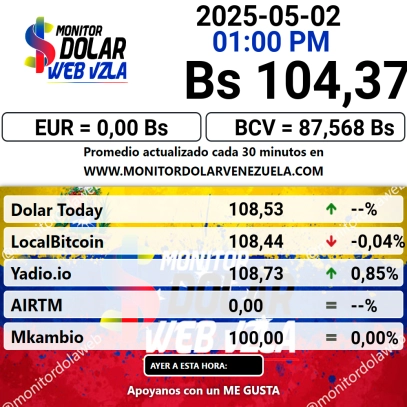 Mientras, el precio del dólar hoy en Venezuela refleja que el cambio en Cúcuta, Colombia, en la frontera con Venezuela, fue de 98,03 bolívares. De igual modo, el dólar Bitcoin está en Bs. 108,44.