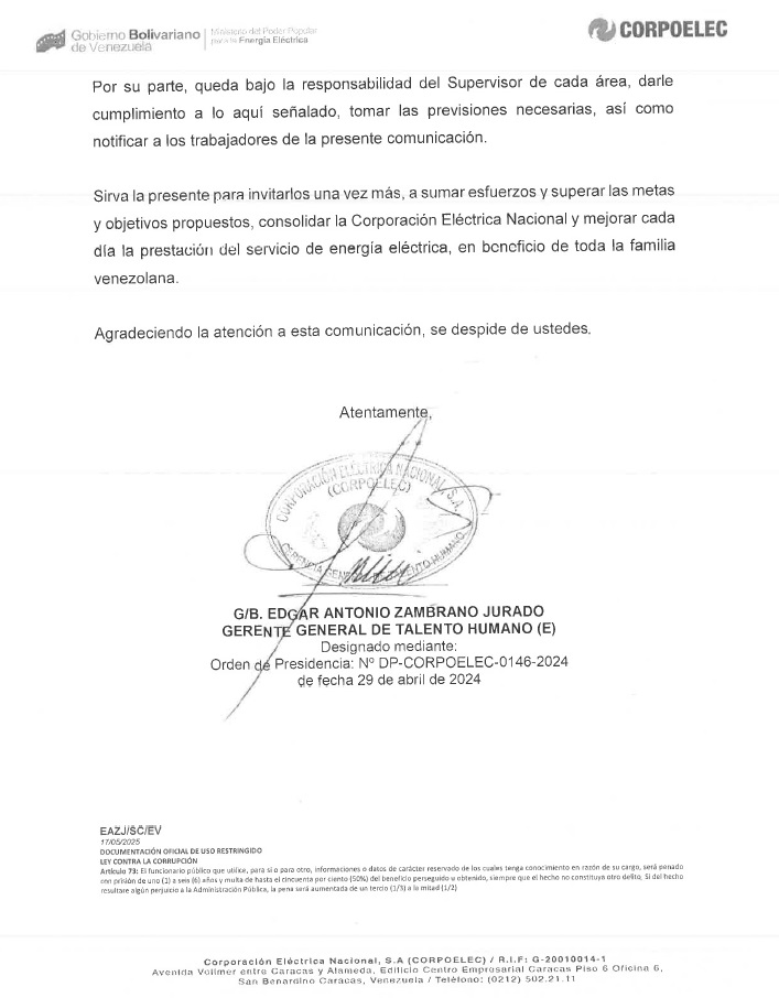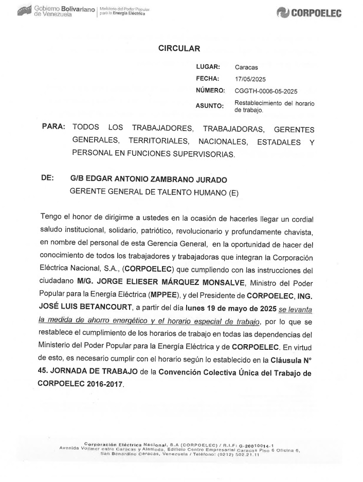 De acuerdo con el comunicado de la estatal eléctrica, anuncian que a partir de hoy se cumplirá con el horario según lo establecido en la Cláusula N° 45. Jornada de Trabajo de la Convención Colectiva Única del Trabajo de Corpoelec 2016-2017.
