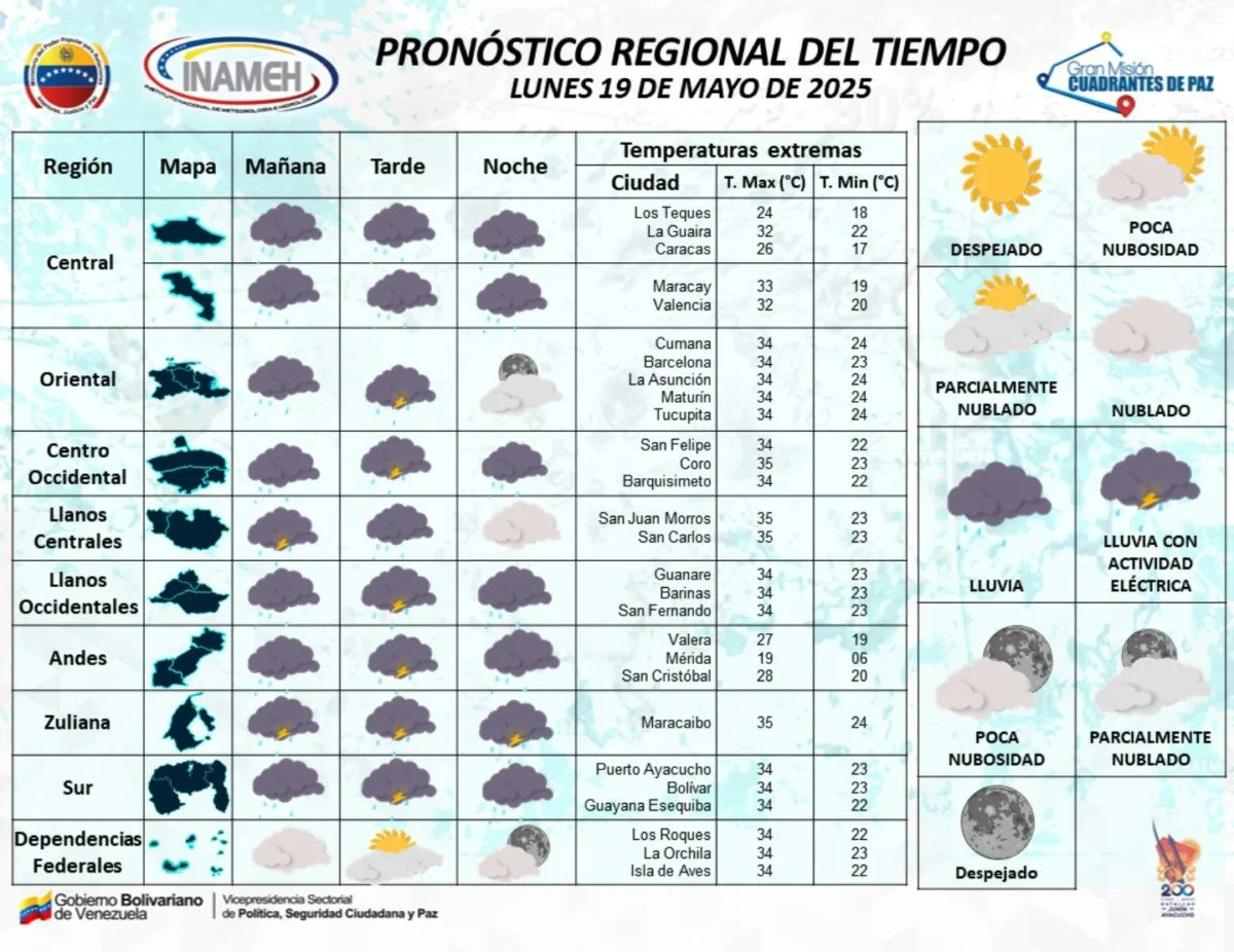 De acuerdo con el pronóstico del Instituto Nacional de Meteorología e Hidrología, más intensas y frecuentes en partes de la Guayana Esequiba, Amazonas, Bolívar, Delta Amacuro, Monagas, Sucre, Lara, llanos occidentales, Andes y Zulia, sin descartar algunas lluvias aisladas en Miranda, Distrito Capital, Aragua, Carabobo y Yaracuy.