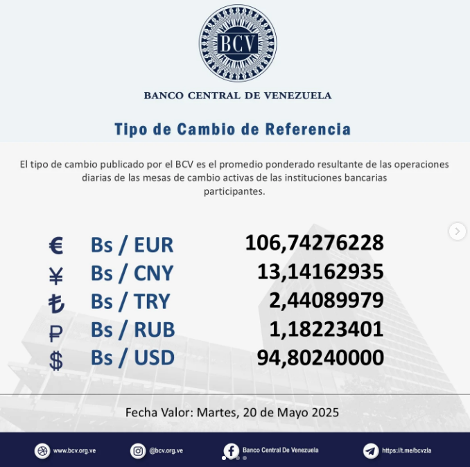 | 19/05/2025 | BBVA Provincial | 94,7575 | 94,7630 |