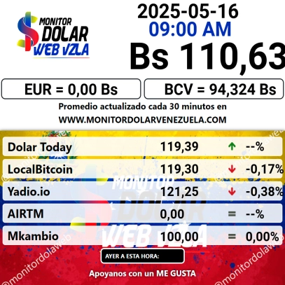 Mientras, el precio del dólar hoy en Venezuela refleja que el cambio en Cúcuta, Colombia, en la frontera con Venezuela, fue de 106,61 bolívares. De igual modo, el dólar Bitcoin está en Bs. 119,10.