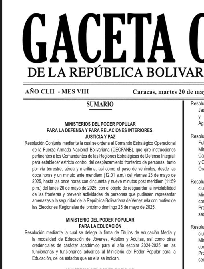 Mediante una resolución conjunta de los ministerios de Defensa y del Interior y Justicia, el gobierno nacional comunica el cierre de fronteras de Venezuela debido a las elecciones programadas para el 25 de mayo.
