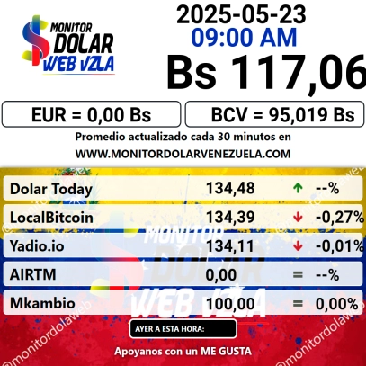Mientras, el precio del dólar hoy en Venezuela refleja que el cambio en Cúcuta, Colombia, en la frontera con Venezuela, fue de 107,77 bolívares. De igual modo, el dólar Bitcoin está en Bs. 118,50.