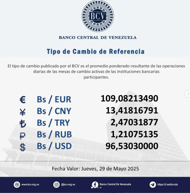 Evolución de la tasa de cambio BCV al 29 de mayo de 2025