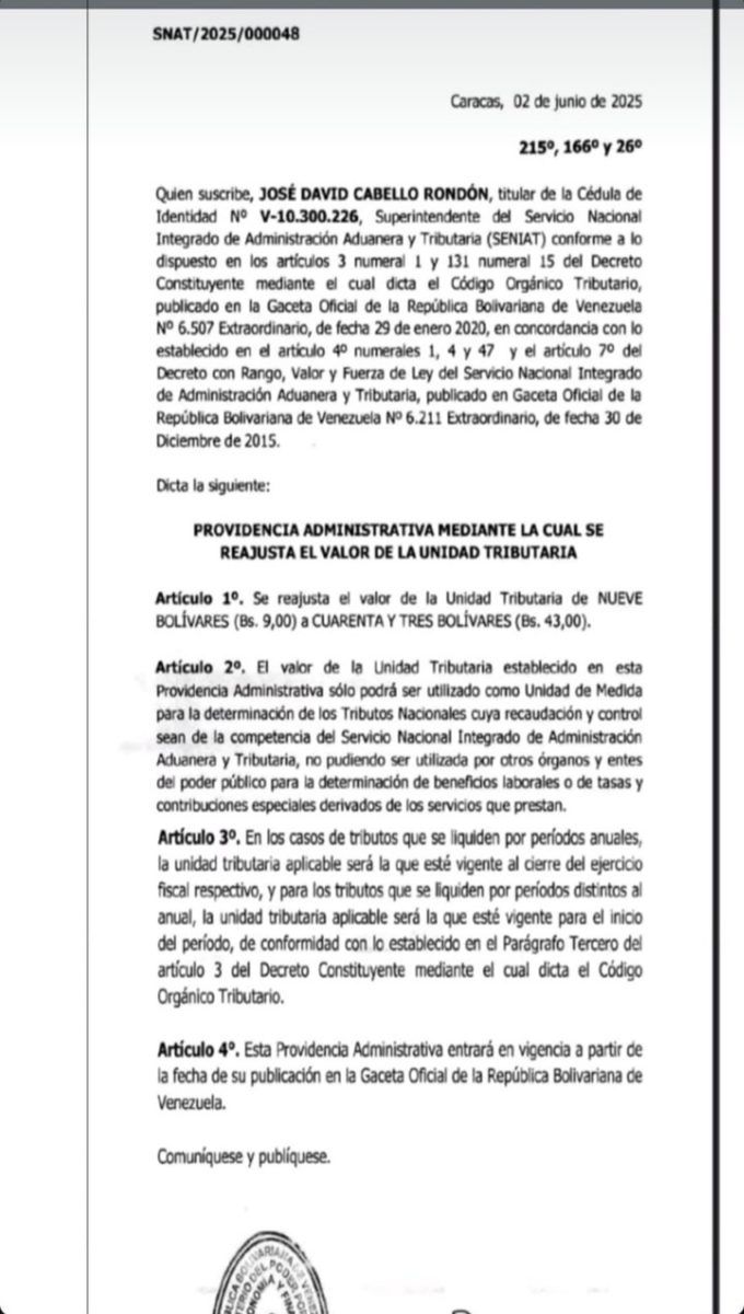 ¡Unidad Tributaria se reajusta! En Gaceta Oficial Número 43.140, de fecha 2 de junio de 2025, fue publicada la resolución del Servicio Nacional Integrado de Administración Aduanera y Tributaria (Seniat), en la cual se reajusta el valor de la Unidad Tributaria (UT) de Bs. 9 a Bs. 43.