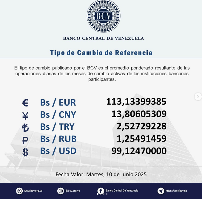 Evolución de la tasa de cambio BCV al 10 de junio de 2025