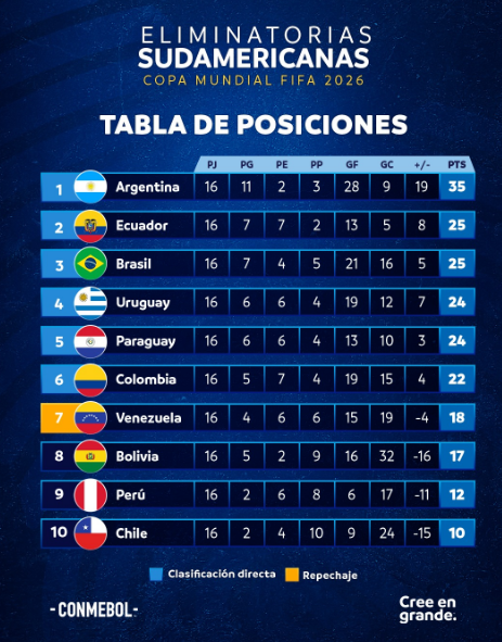 Chile, por su parte, quedó eliminado tras caer 2-0 ante Bolivia en El Alto. La ‘Verde’, gracias a los tantos de Miguel Terceros y Enzo Monteiro, mantiene vivas sus aspiraciones al repechaje, ubicándose en el octavo lugar con 17 puntos.