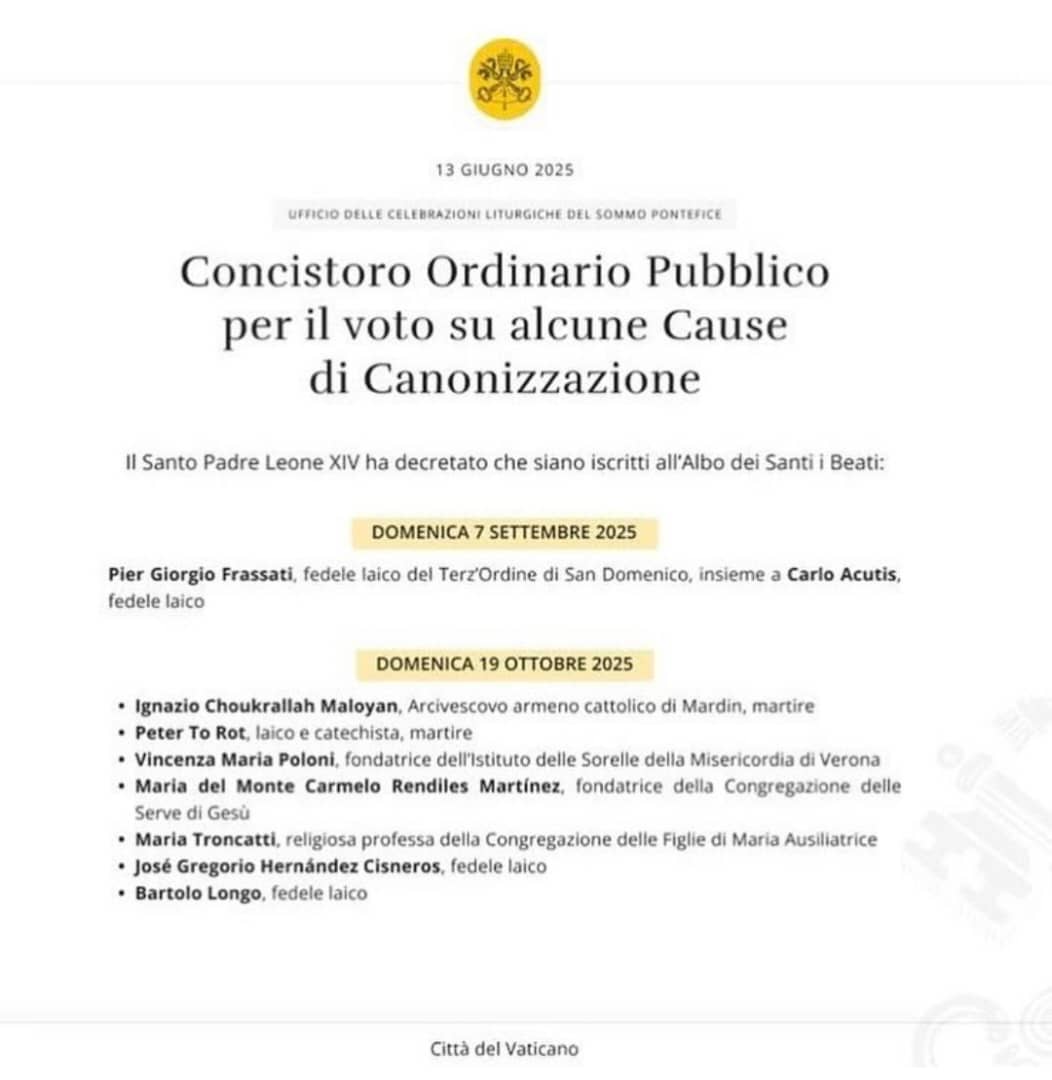 En el consistorio, el papa anunció que la canonización de Pier Giorgio Frassati tendrá lugar el 7 de septiembre de 2025, junto a la de Carlo Acutis, cuya santidad ya fue confirmada en una sesión anterior.