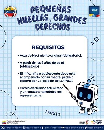 El Servicio Administrativo de Identificación, Migración y Extranjería (Saime) dio a conocer a través de sus redes sociales el inicio de la tercera fase de cedulación para niños y niñas, en seguimiento de la ruta «Pequeñas Huellas, Grandes Derechos».