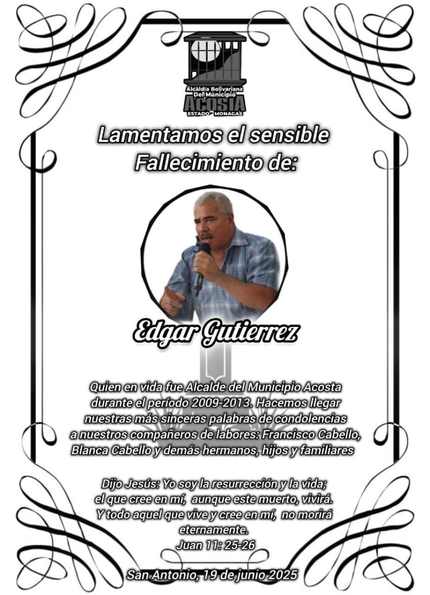 Este jueves 19 de junio se conoció a través de las redes sociales, el fallecimiento de Edgar Gutiérrez, exalcalde del municipio Acosta durante el periodo 2009 – 2013, tras batallar contra el cáncer.