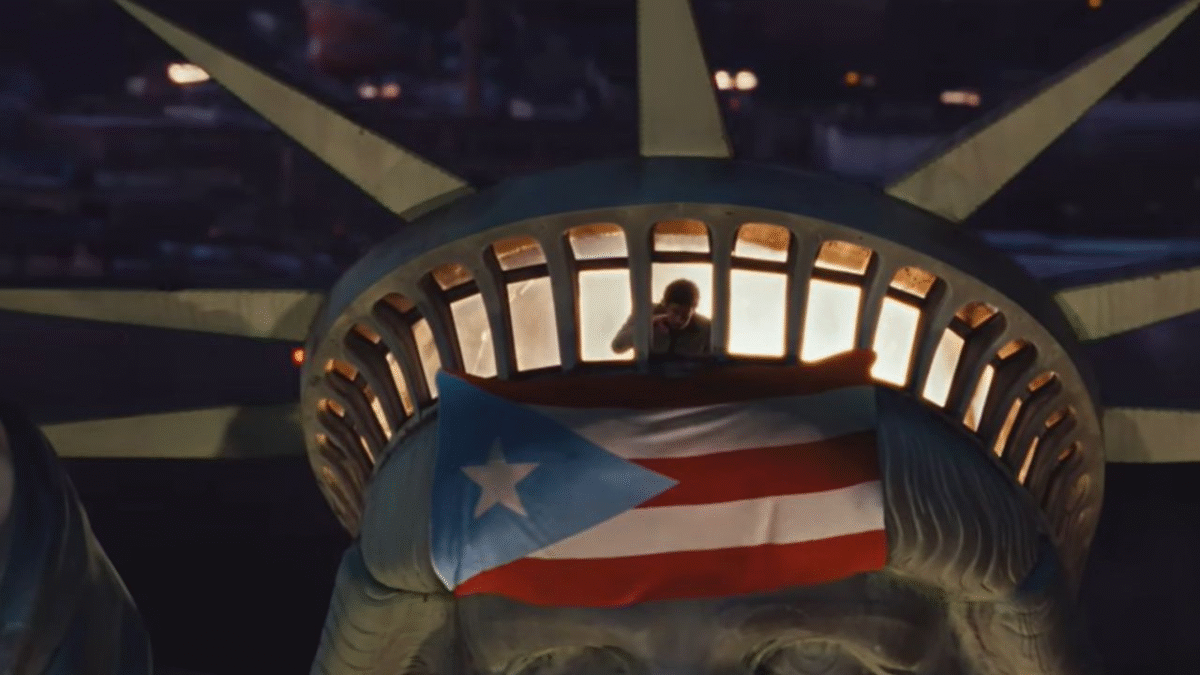 Pasados los dos minutos de un videoclip que dura 3:43, el artista aparece en la Estatua de la Libertad con una bandera de Puerto Rico en la frente de la icónica obra ubicada en Nueva York. Y se muestra con un azul celeste, el tono utilizado por los independentistas que rechazan la anexión a EE. UU.