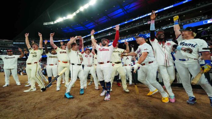 Kyle Schwarber, de Phillies de Filadelfia, vol贸 la cerca en los tres swings que realiz贸 y dej贸 la mesa servida para el mexicano Jonathan Aranda, de Rays de Tampa Bay, quien no pudo conectar jonr贸 en la 煤ltima oportunidad de la Liga Americana, desatando la celebraci贸n de los jugadores del Viejo Circuito.