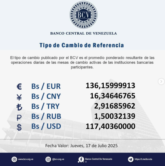 Evolución de la tasa de cambio BCV al 17 de julio de 2025