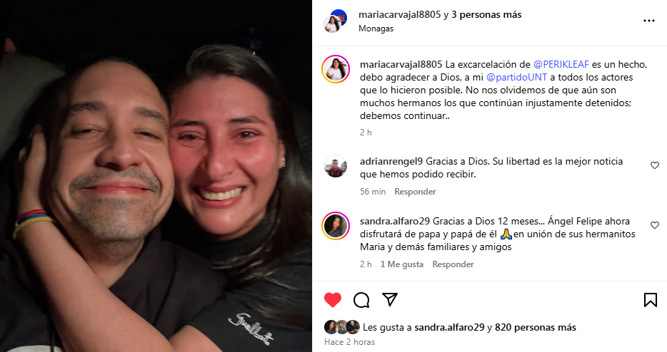 La información fue difundida por su esposa, María Carvajal, a través de su cuenta de Instagram, donde escribió «La excarcelación de @PERIKLEAF es un hecho, debo agradecer a Dios, a mi @partidoUNT a todos los actores que lo hicieron posible. No nos olvidemos de que aún son muchos hermanos los que continúan injustamente detenidos».