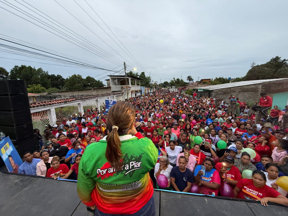 El acto revolucionario comenzó en la plaza Bolívar de esa localidad, donde una multitudinaria marea roja salió junto a la «candidata del amor» a recorrer las calles hasta llegar a la tarima donde la esperaban más hermanos piareños con pitos, globos y matracas, como muestra de respaldo a la aspirante que en casi cuatro años de gestión ha hecho de Piar un municipio próspero.