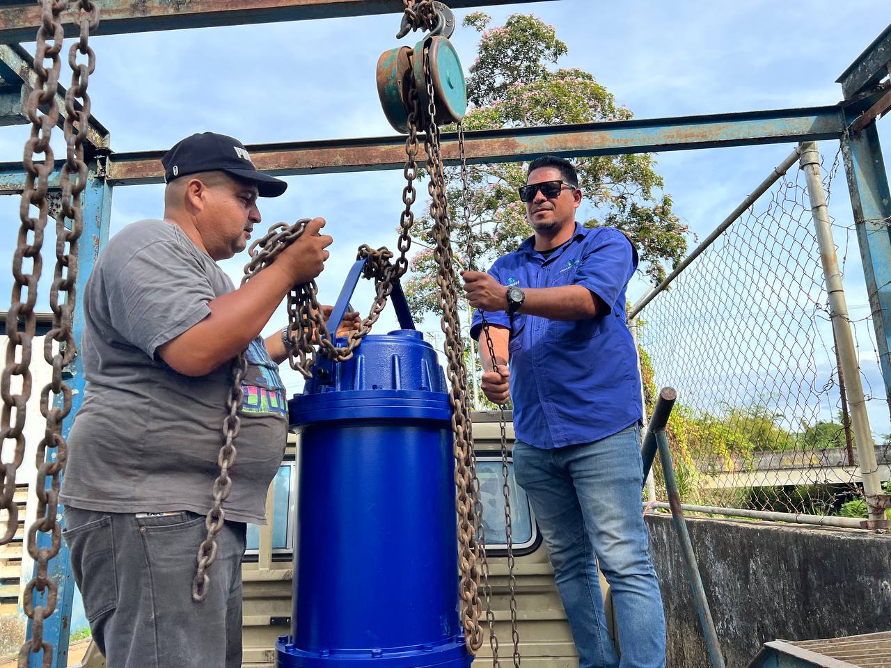 El equipo multidisciplinario del Agua instala la nueva bomba sumergible de 60 hp en la planta potabilizadora Puente Quemado.