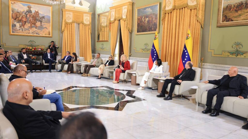 La presidenta encargada, Delcy Rodríguez, lideró este martes una reunión con las distintas comunidades religiosas del país, en los espacios del salón Sol del Perú, en el Palacio de Miraflores, en Caracas.