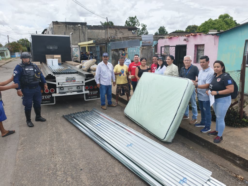 Danielys León, secretaria de la dependencia, detalló que entre los materiales entregados a las familias afectadas están láminas de zinc, cemento, pintura, colchones matrimoniales e individuales, televisores, cocinas y neveras.