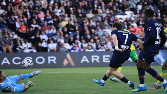 Paris Saint-Germain, PSG, goleó al Nantes por 3-0 y olvidó la derrota del último partido frente al Lyon, gracias a un partidazo de Khvicha Kvaratskhelia, autor de un doblete, para colocarse con cuatro puntos de ventaja sobre Lens, segundo, a falta de cinco jornadas y un enfrentamiento directo.
